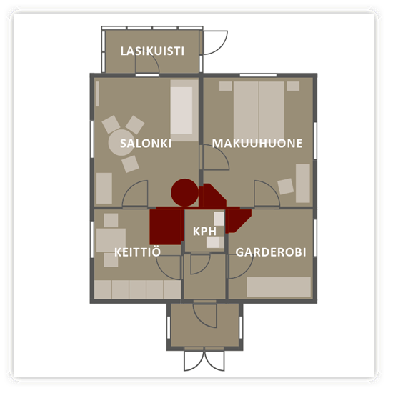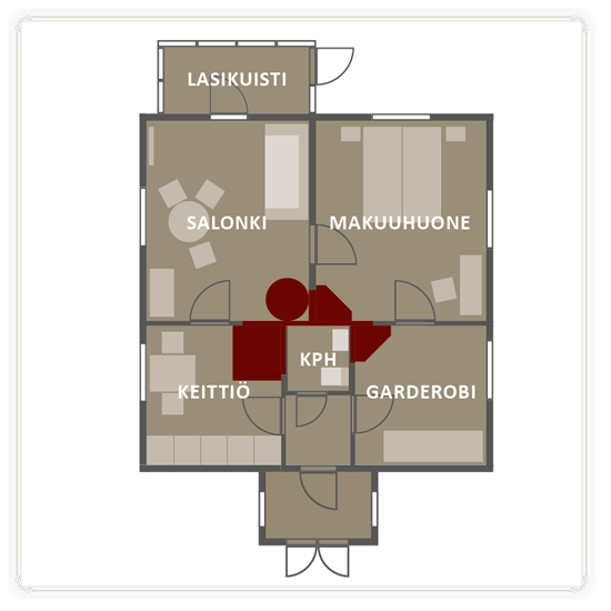 - Peruslämmitys sähköpattereilla. Lisäksi lämmitämme talven pakkasilla kakluunin ja uunit vieraita varten.